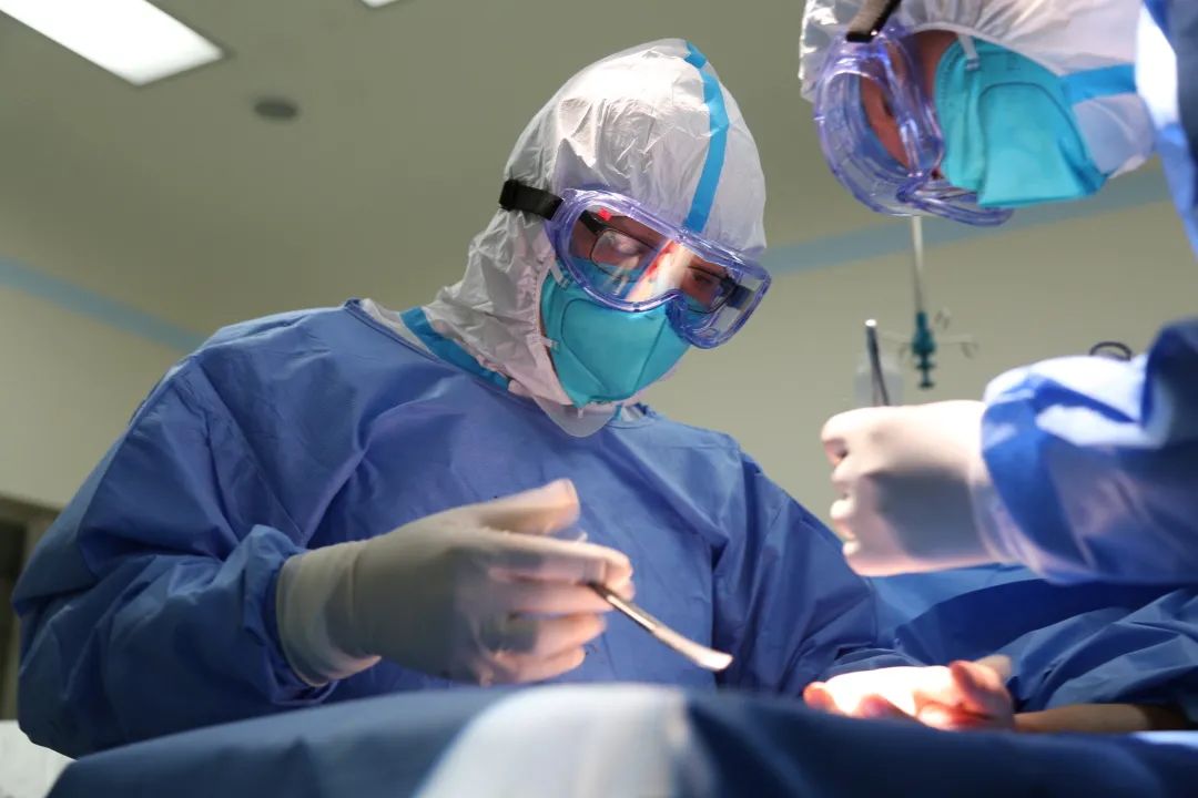 所有参与手术的医护人员严格按照三级防护要求:内穿无菌一次性手术衣,外层穿戴好防护服、护目镜、手套、靴套,手术操作难度明显加大。此次手术难点在于,伤指血管、神经损伤严重,末节血管细小,动脉直径仅0.6mm,静脉较少,通常无再植条件,且该手术须全程在高倍显微镜下操作,需要极强的显微外科手术功底。